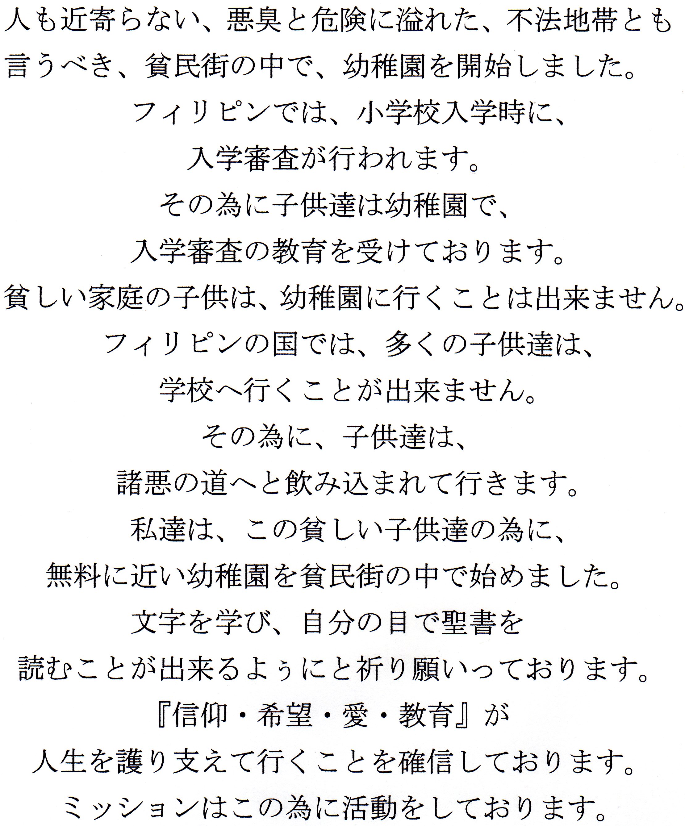 私達は、日本の皆様の尊い溢れるばかりの御支援を戴いて、この貧困の中の子供達の為に幼稚園を設立し、無料に近い状況で、貧しい家庭の子供だけが入れる幼稚園運営を行っております。可愛い子供達が、学校へ行くことによって、この負の連鎖を断ち切り、明るい、希望に溢れた素晴らしい人生への皆様の第一歩へと、皆様と共にこの地で励んでおります。